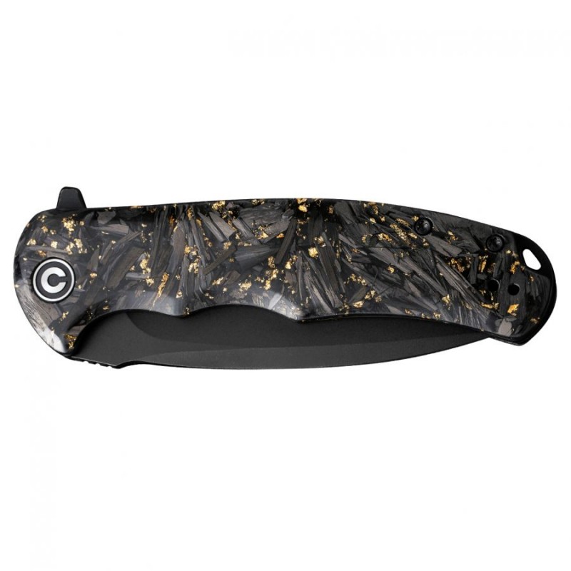 Rękojeść Civivi Praxis wykonano z zabarwionego na czarno włókna węglowego, w które wtopiono złote drobiny. Chropowata faktura okładzin sprawia, że nóż dobrze leży nawet w spoconej dłoni. Dzięki otwartej konstrukcji (ang. open backed) narzędzie można czyścić i oliwić bez większych problemów.