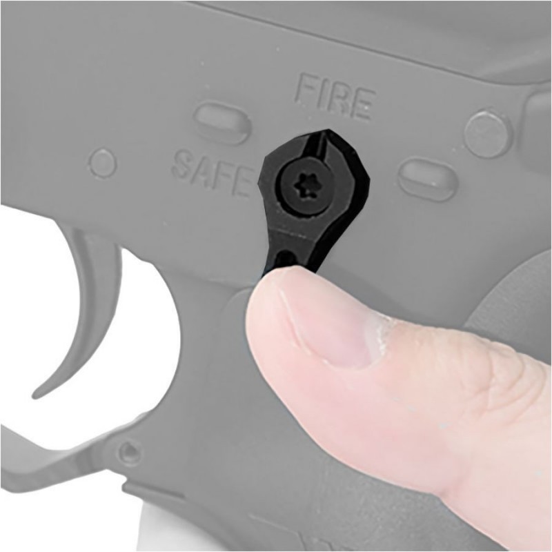 Dźwignia, wykonana z frezowanego aluminium, zabezpieczonego anodowaniem na czarno, jest wytrzymała i niezawodna. Powiększone skrzydełka i karbowanie zapewnia palcom dobre oparcie, dzięki czemu tryb ognia można zmienić szybko i płynnie.