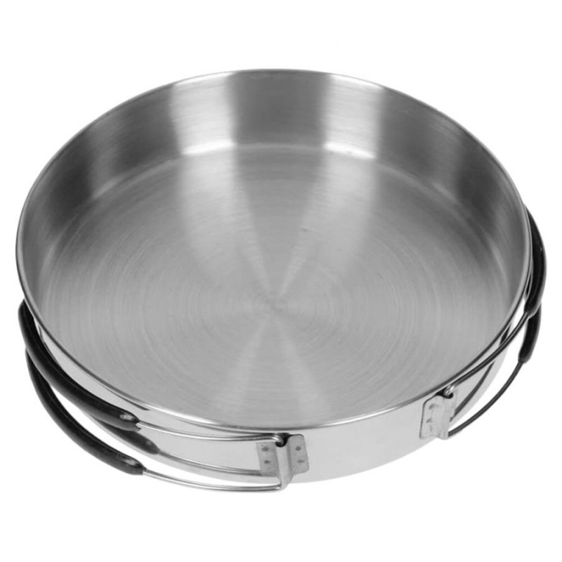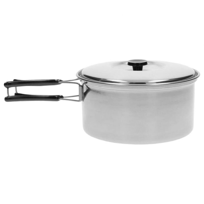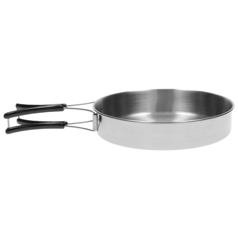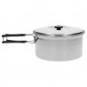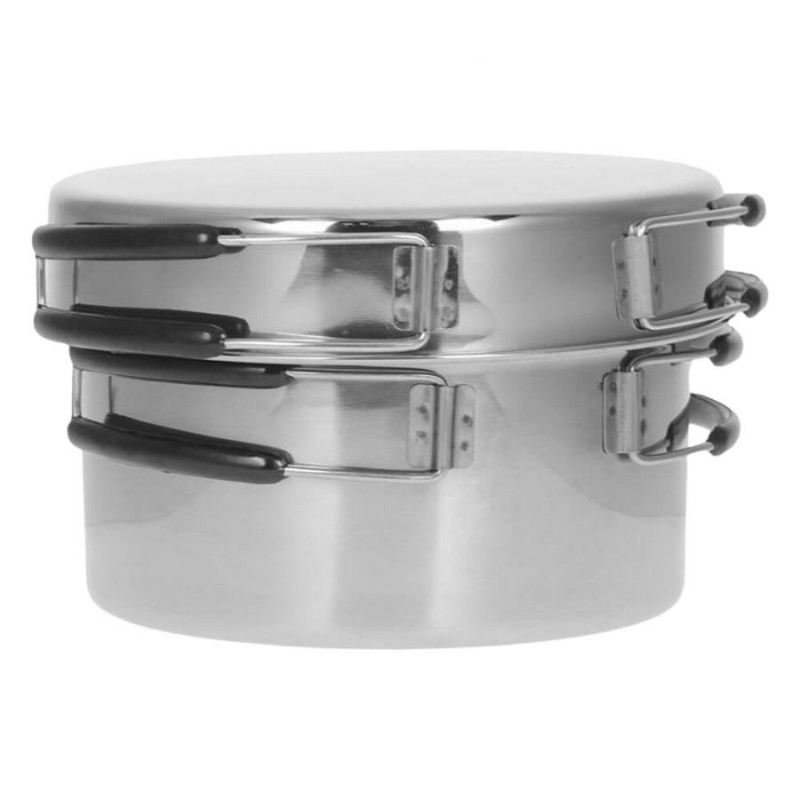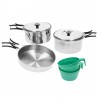 Naczynia są wykonane z polerowanej stali nierdzewnej. Zestaw zawiera głęboką patelnię z uchwytem, dwa garnki z pokrywkami oraz dwa plastikowe kubki o pojemności 220 ml. Komplet po złożeniu zajmuje niewiele miejsca i łatwo mieści się w turystycznym plecaku. Ochronę podczas przenoszenia zapewnia nylonowy pokrowiec.