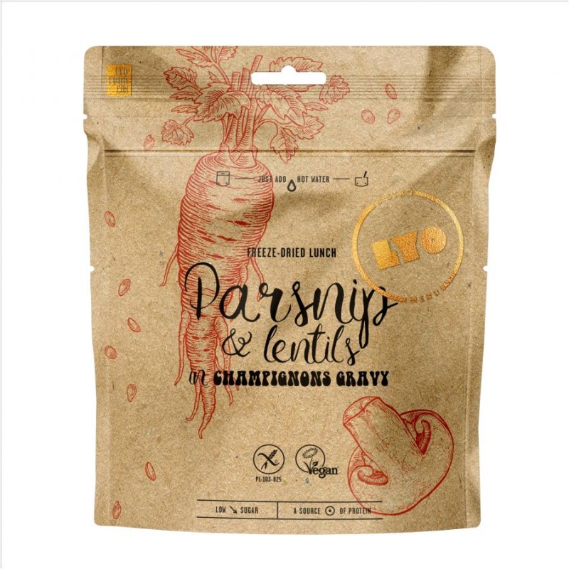 LyoFood Eko pasternak i soczewica w sosie pieczrkowym 270 g Bistro to syty turystyczny posiłek. Nowa odsłona turystycznych liofilizatów: zdrowsza, ekologiczna i smaczna. Duży nacisk został położony na aspekty ekologiczne.