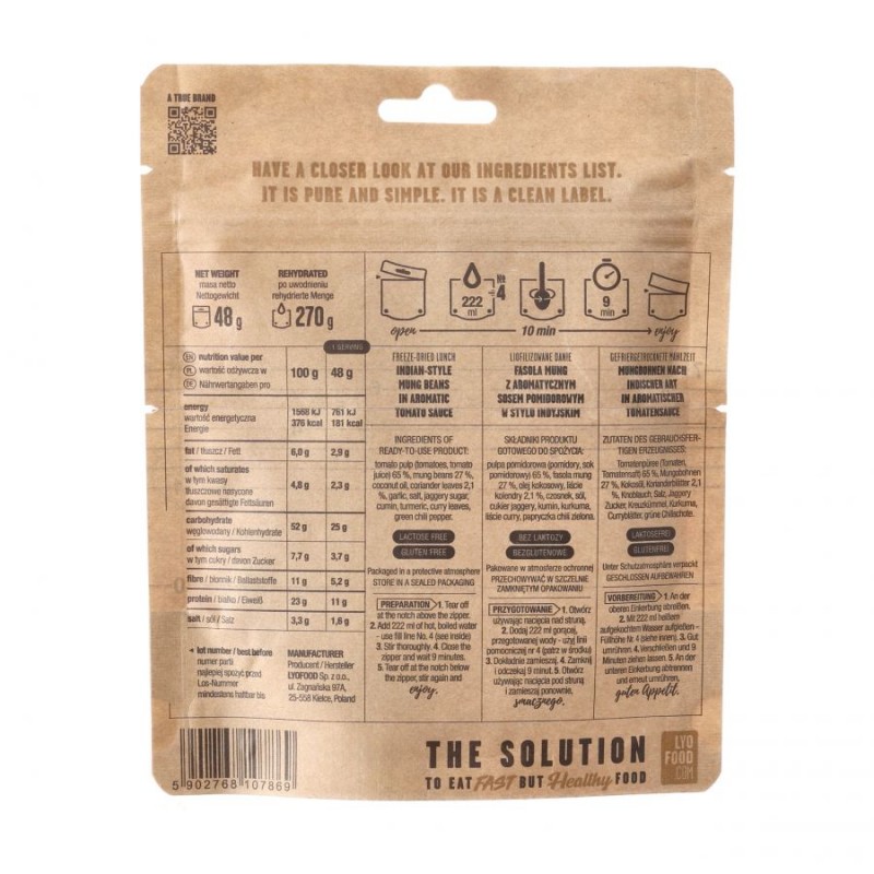 W wersji LyoFood fasola mung została zanurzona w gęstym sosie pomidorowo-kokosowym, wzbogaconym aromatycznymi przyprawami, takimi jak kolendra, kumin, kurkuma i liście curry. Delikatny czosnek oraz jaggery, czyli nierafinowany cukier z trzciny cukrowej, dopełniają smaku, tworząc wyjątkową wegańską wersję klasycznego indyjskiego dania.