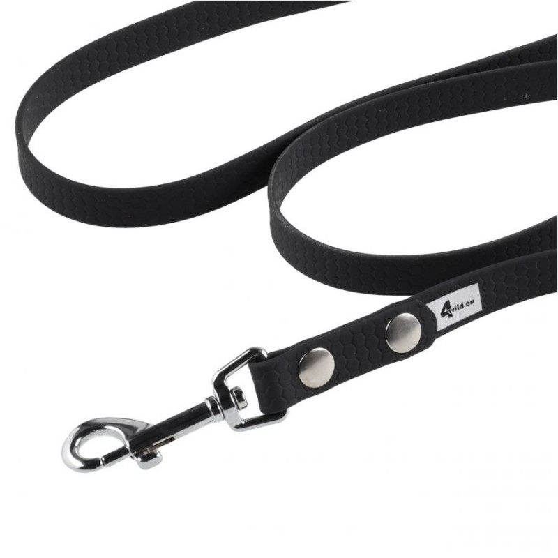 Smycz dla psa BioThane wodoodporna od firmy specjalizującej się w produkcji akcesoriów dla zwierząt 4wild. Smycz została wykonana z taśmy BioThane w kolorze czarnym o szerokości 16 mm i długości 200 cm.