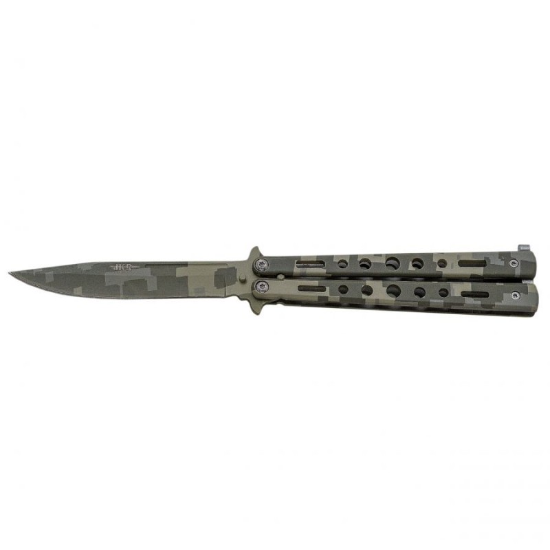 Joker JKR721 to militarny nóż motylkowy typu balisong o solidnej metalowej konstrukcji i kamuflowanym wykończeniu.