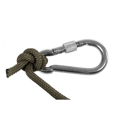 Wraz z liną otrzymujemy karabińczyk ze stali nierdzewnej 304 SS o wielkości 80×40 mm. Karabińczyk z liną można błyskawicznie wpinać do oczkowej śruby. Sprawdzona lina i wytrzymały karabińczyk skutecznie ogranicza ryzyko utraty magnesu.