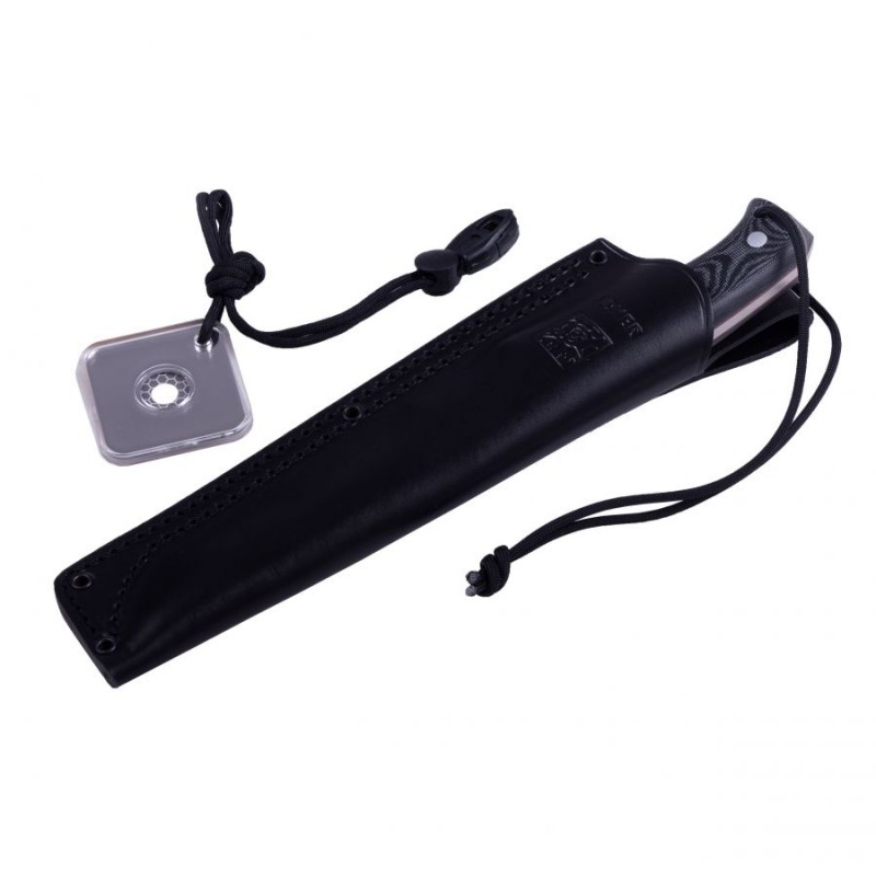 Do noża dołączona jest skórzana pochwa, ułatwiająca przenoszenie narzędzia. W zestawie znajduje się również 2-metrowa linka paracord 550, przydatna w różnych outdoorowych sytuacjach.