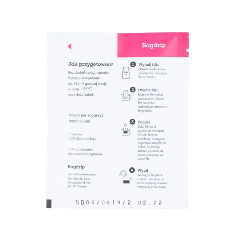 Bagdrip to po prostu jednorazowa saszetka wypełniona naturalną kawą o idealnie dobranej ziarnistości. W torebce, która pełni funkcję filtra, znajduje się świeżo mielona kawa z ziaren z wybranych rejonów świata. Jedna saszetka Bagdrip umożliwia przygotowanie około 185 ml aromatycznej kawy, niemal w każdych warunkach. Przygotowanie napoju jest proste, szybkie i wymaga jedynie kubka, gorącej wody oraz towarzystwa, w którym będziemy delektować się smakiem i aromatem ulubionej kawy.