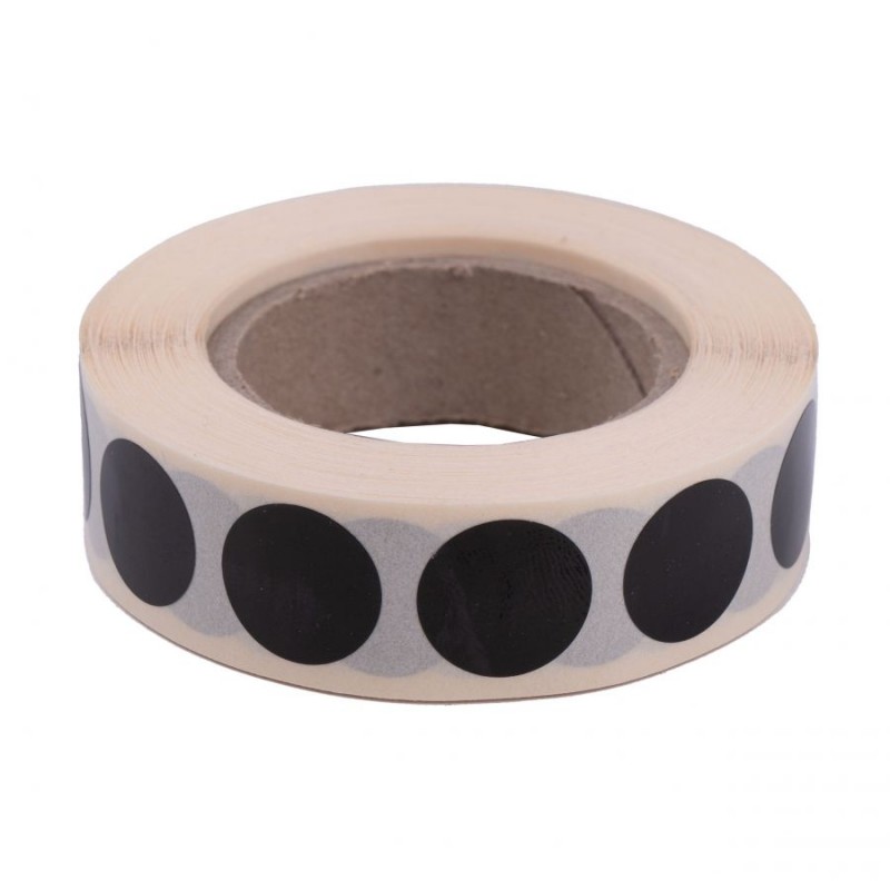 Rolka czarnych zaklejek do przestrzelin pistoletowych i karabinowych. Średnica pojedynczej zaklejki wynosi 16 mm.