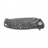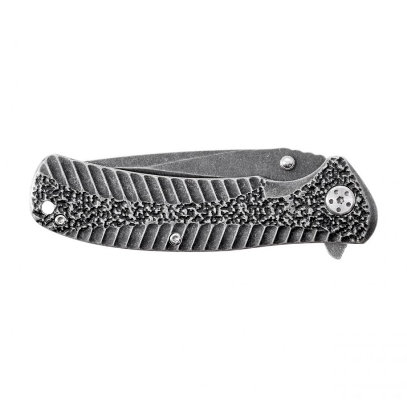 Rękojeść noża tworzą okładziny z oksydowanej stali nierdzewnej, delikatnie profilowane do dłoni. Efektowne poprzeczne frezowanie skutecznie przyciąga uwagę oraz zwiększa przyczepność noża do dłoni.