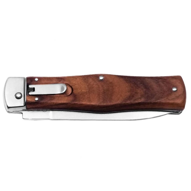 Nóż mają profilowane okładziny z drewna tropikalnego palisandru, mocowane przy użyciu nitów. Profilowany kształt rękojeści w połączeniu z szorstką fakturą tworzywa zapewniają doskonałą przyczepność noża oraz komfort użytkowy. Z uwagi na brak klipsa, do codziennego noszenia noża zastosowano skórzane etui na pas, zamykane na napę.