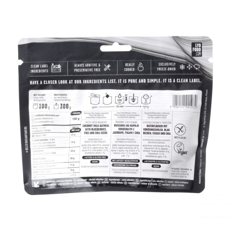 Żywność liofilizowana LyoFood Owsianka figowo-jagodowa 300 g – pożywne śniadanie na dobry początek dnia. Bezglutenowe płatki owsiane, gotowane w napoju kokosowym, w połączeniu z soczystymi jagodami, figami i nasionami chia tworzą idealną propozycję na każdy poranek. Odrobina syropu z agawy dodaje delikatnej słodyczy, a całość dostarcza energii, niezależnie od tego, czy wybierasz się w góry, czy masz intensywny dzień w pracy.