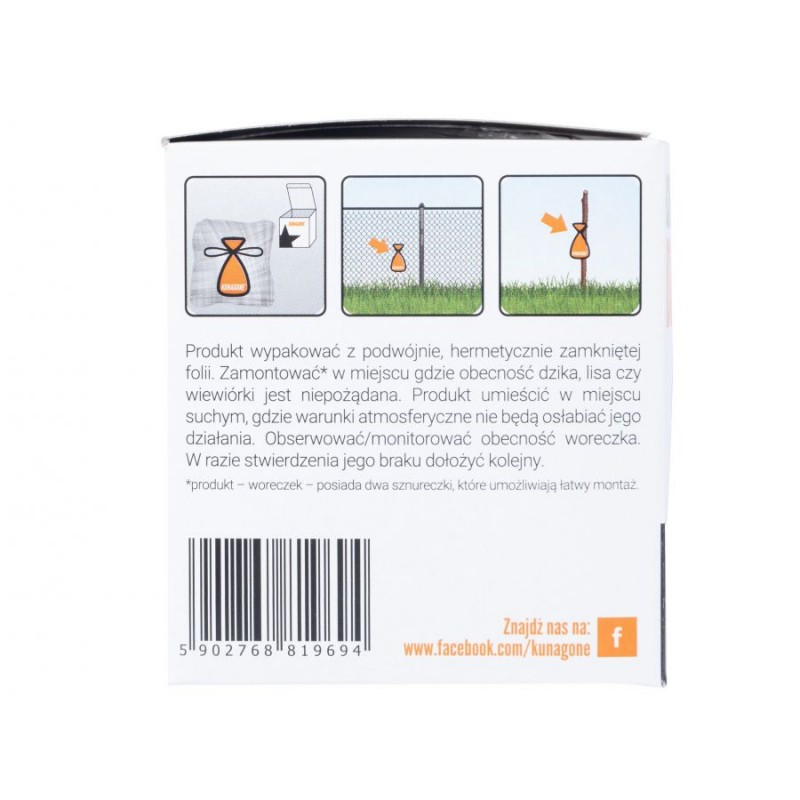 Kunagone nie wymaga zasilania i stosowania żadnych narzędzi, wystarczy umieścić środek na obszarze potencjalnej aktywności zwierząt najlepiej w miejscu, które nie jest narażone na działanie deszczu i wilgoci. Odstraszacz można mocować na ogrodzeniu, tyczkach lub zadaszeniach.