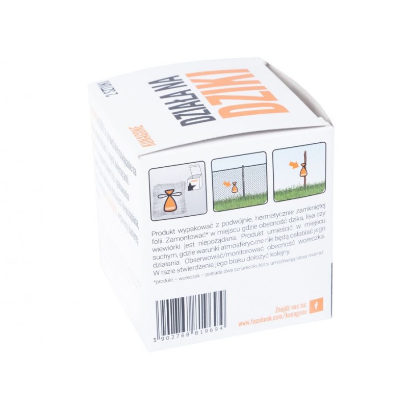 Kunagone to autorski i całkowicie naturalny środek zapachowy, który działa odstraszająco na dzikie zwierzęta (m.in. dziki, lisy, wiewiórki) odpowiedzialne za szkody w ogrodzie i straty w inwentarzu. Dzikie zwierzęta często bywają nieproszonymi gośćmi w ogrodach i zagrodzie, stanowiąc nie tylko zagrożenie dla domowników, ale też wyrządzając szkody w uprawach. Mieszkając w pobliżu lasu, często jesteśmy narażeni na wizytę dzików, które w poszukiwaniu żywności niszczą trawniki i grządki z warzywami. Zwierzęta te są także często odpowidzialne za odpowiedzialne niebezpiecznych chorób i mogą uciążliwie zakłócać ciszę nocną.