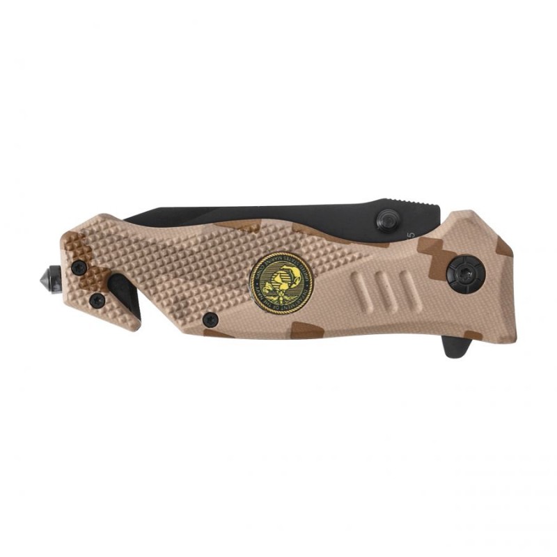 Wykonanie rękojeści z aluminium w piaskowym kolorze nadaje nożowi wytrzymałości i agresywnego designu. W okładzinach wykonano otwory dla odciążenia i przesunięcia środka ciężkości w stronę czubka ostrza. Nóż składany Kandar N343 dobrze trzyma się w dłoni. Specjalnie wyprofilowana rękojeść stabilizuje chwyt i zabezpiecza przed ześlizgnięciem się ręki na ostrze.