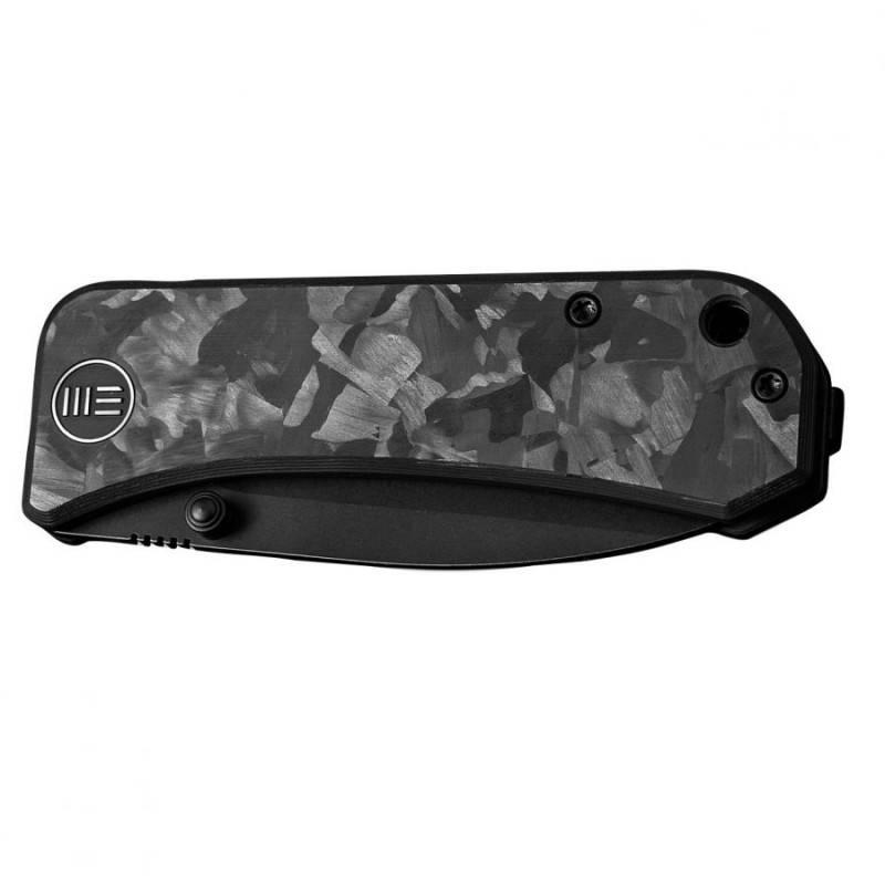 Klingę WE Banter wykuto ze stali CPM-S35VN, zapewniającej znakomitą trwałość i odporność na korozję. Głownię typu Spear Point, zahartowaną do 58-60 HRC, otwieraną za pomocą kołka pod kciuk, wykończono metodą Black Stonewash. Rękojeść wykonano z włókna węglowego i stali. Całość blokuje sprawdzony mechanizm Liner Lock.