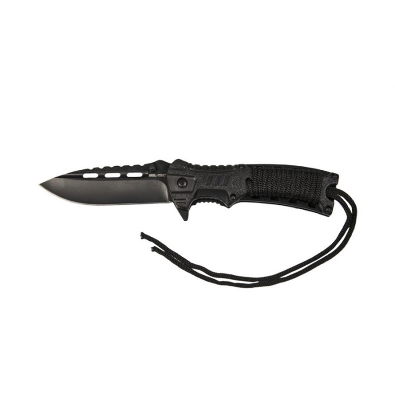 Klingę Mil-Tec Paracord wykuto ze stali nierdzewnej 3CR13, zapewniającej dobrą trwałość i odporność na korozję. Głownię typu Clip Point, otwieraną za pomocą flippera lub kołka pod kciuk, oksydowano. Oplecioną paracordem rękojeść wykonano z zabarwionego na czarno tworzywa ABS. Całość blokuje sprawdzony mechanizm Liner Lock.