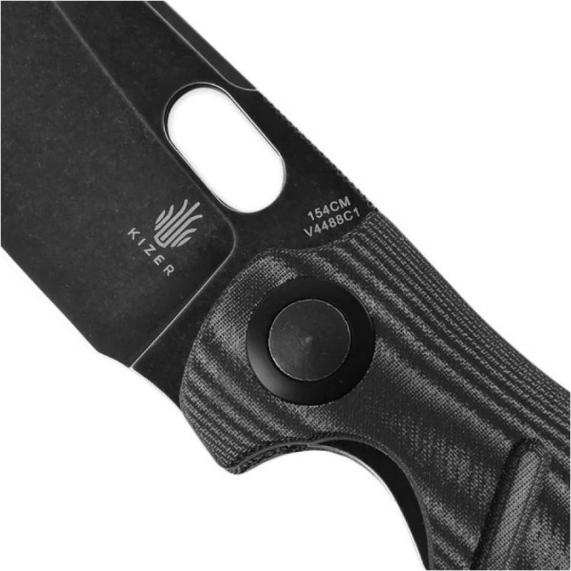 Ostrze można w wygodny i szybki sposób rozłożyć jedną ręką za pomocą dużego otworu w głowni, który jest wygodny dla osób prawo i leworęcznych. W konstrukcji zastosowano wysokiej jakości materiały Kizer Sheepdog V4488C1 posiada okładziny z czarnego laminatu G10 o chropowatej fakturze z karbowaniem, dzięki czemu zapewnia pewny i bezpieczny chwyt nawet mokrymi lub zabodzonymi rękoma. Ich odpowiednie wyprofilowanie i głębokie wcięcie na palec gwarantują pewny chwyt w każdych warunkach.