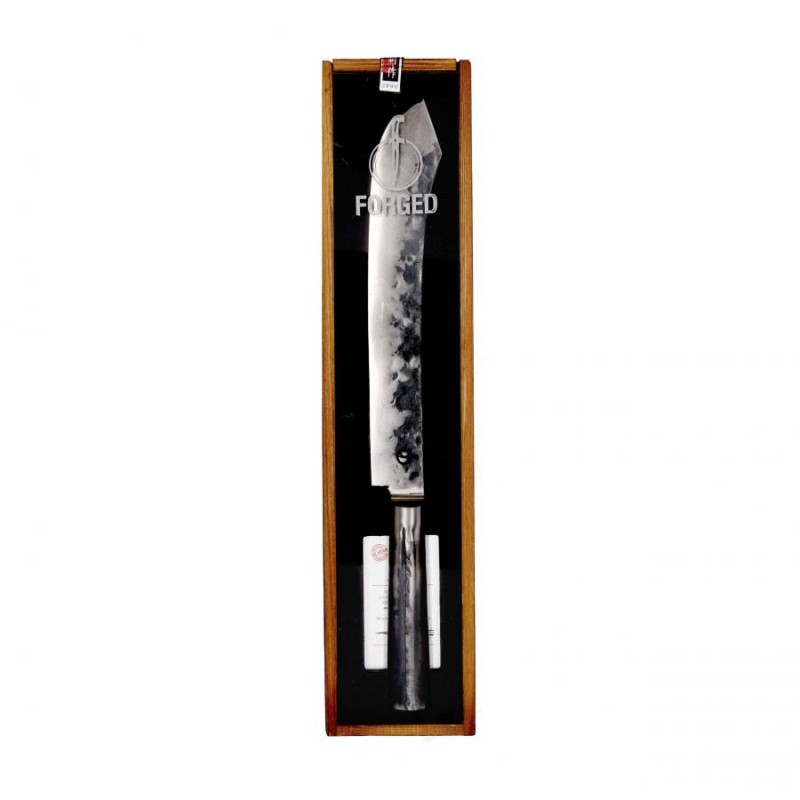 Nóż rzeźnicki Forged Butcher’s Knife Intense oferuje użytkownikowi:Jak sama nazwa wskazuje, domeną marki Forged są noże kuchenne wykonane w tradycyjnej technologii kucia. Dzięki temu zabiegowi otrzymujemy wysokiej klasy narzędzia, przewyższające znacząco modele walcowane zarówno pod kątem wytrzymałości jak i sztywności co ułatwi precyzyjne ciecie twardych materiałów. Pozostałością po procesie skuwania stali jest tekstura zdobiąca nieszlifowaną krawędź głowni, która nadaje każdemu egzemplarzowi niepowtarzalnego charakteru.