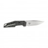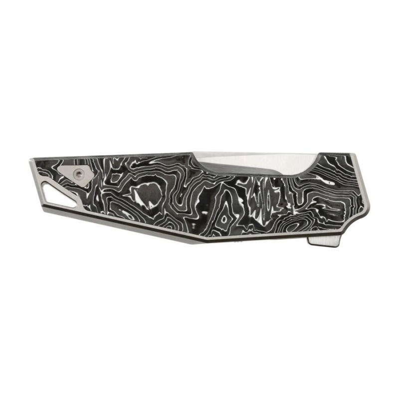 Uwagę z pewnością przykuwają okładziny, wykonane z materiału wytwarzanego przez docenianą w ostatnich latach firmę Fat Carbon. W tej wersji nóż otrzymał przypominający damast laminat włókna węglowego oraz aluminium. Poprzez charakterystykę procesu produkcji wzór różni się w każdym egzemplarzu noża. W zestawie znajdziemy również dwa klipsy - prawy i lewy - aby zapewnić możliwość wygodnego użytkowania, przy zachowaniu założonego wzornictwa - z tym że w lustrzanym odbiciu.