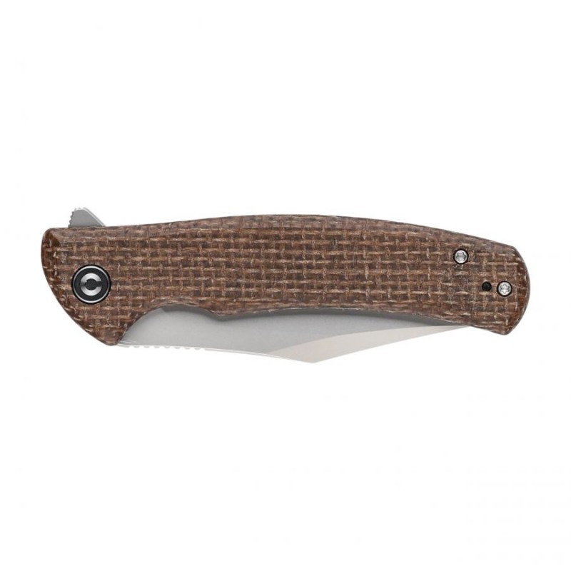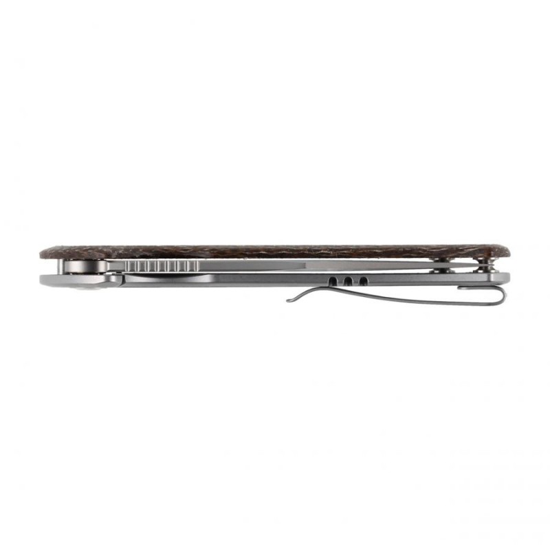 Okładziny rękojeści wykonano z połączenia brązowej micarty i stali. Wygładzone krawędzie okładzin poprawiają pewność uchwytu i sprawiają, że nóż dobrze leży w dłoniach.