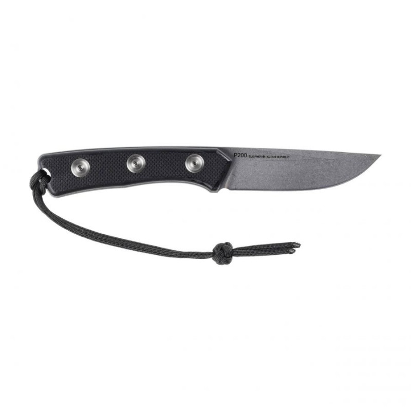 Nóż P200 posiada okładziny rękojeści z wytrzymałego materiału G10 w kolorze czarnym, który zapewnia pewny i bezpieczny chwyt nawet moktymi i brudnymi rękoma. W tylnej częsi rękojeści znajduje się otwór, przez który można przewlec smycz zabezpieczającą lub paracord.