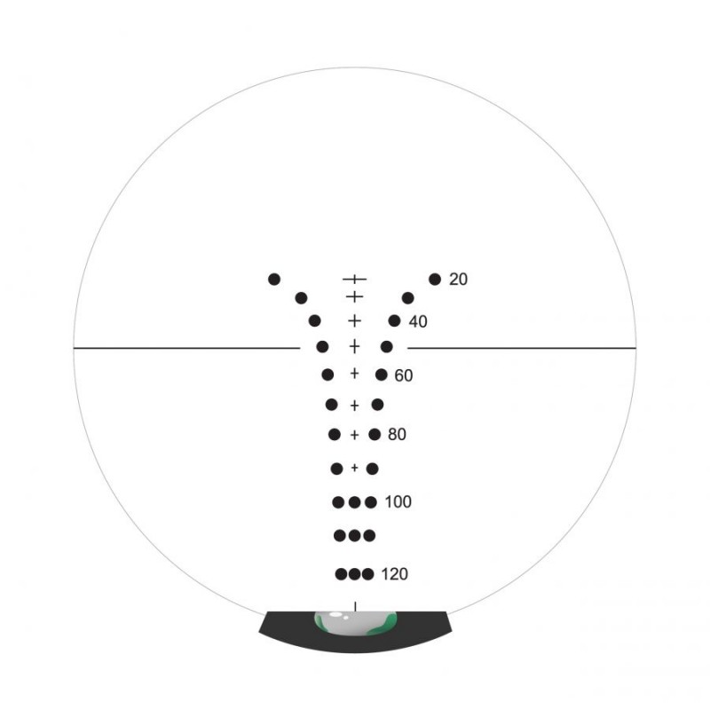 Funkcjonalność celownika zapewnia siatki celownicza podświetlana na 2 kolory (czerwony lub zielony) z 7-stopniową skalę regulacji, co pozwala na dostosowanie jasności i koloru krzyża do panujących warunków oświetleniowych, a także własnych preferencji.