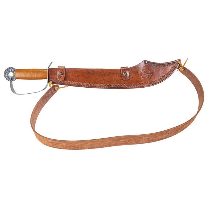 Użytkownik wraz z maczetą otrzymuje wysokiej jakości, ręcznie wykonaną ze skóry pochwę w kolorze brązowym. Pochewka posiada uchwyt umożliwiający przłożenie jej przez ramię.