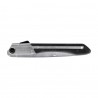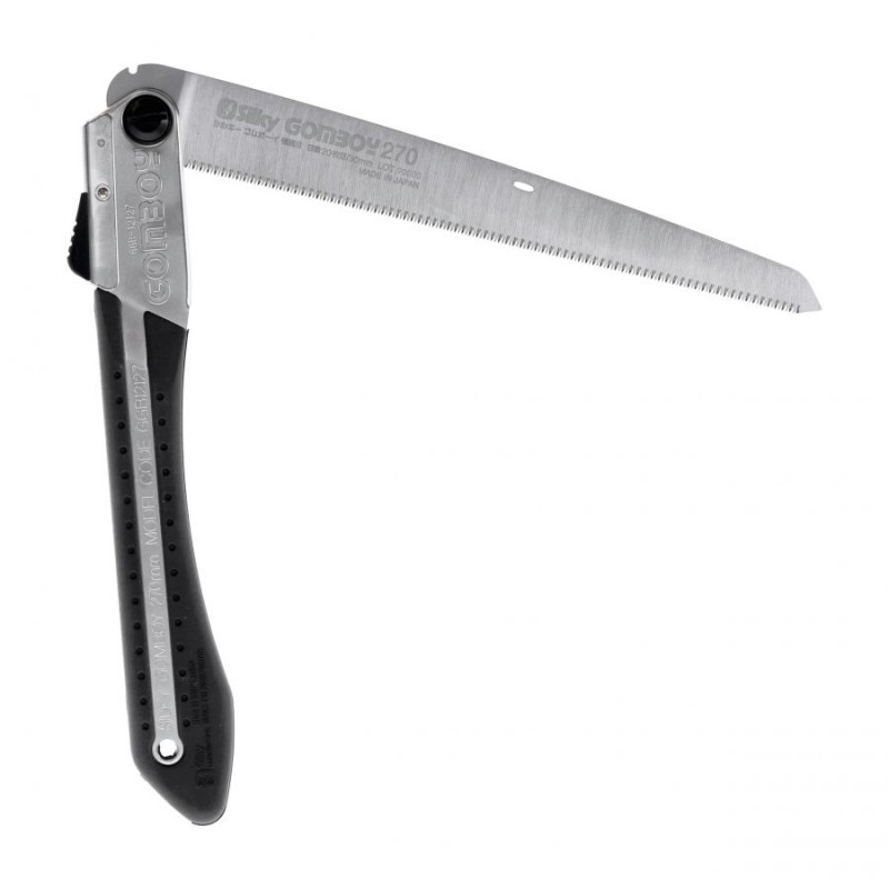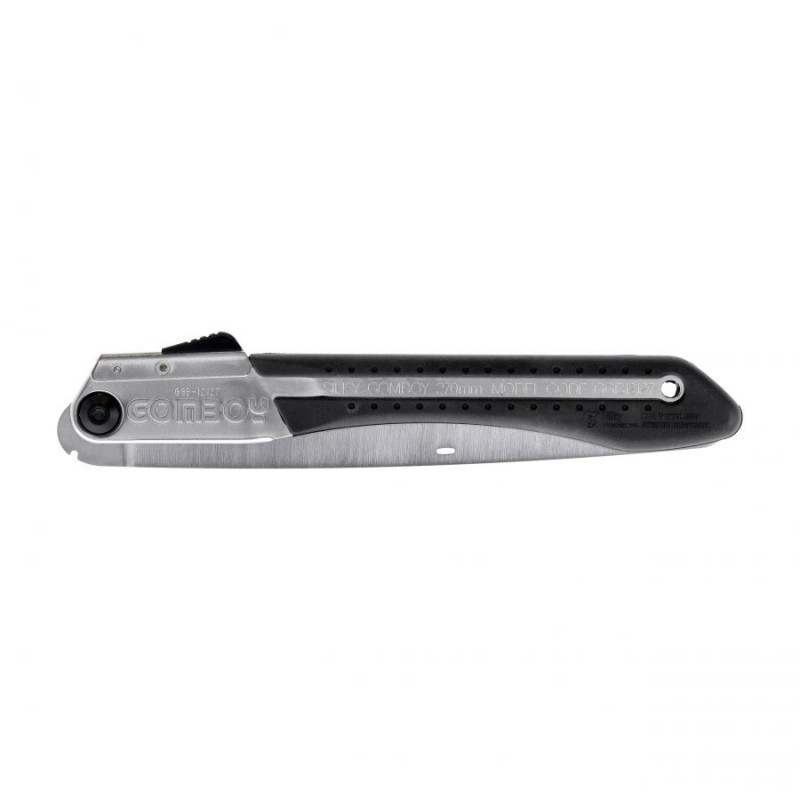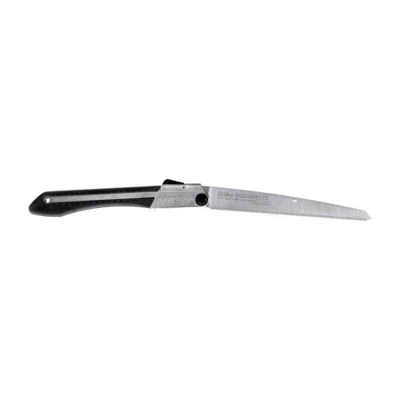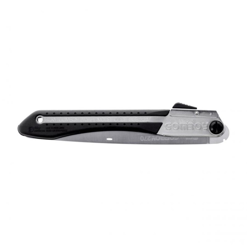 Wydłużona rękojeść piły Gomboy 270-20 zwiększa wygodę pracy i zmniejsza wysiłek, który należy wnieść podczas piłowania. Gumowany materiał rękojeści zapobiega wyślizgiwaniu się piły z ręki, co pozytywnie wpływa na nasze bezpieczeństwo. Piła jest składana w taki sposób, że ostre zęby schowane są w rękojeści. Pozwala to na bezpieczne przenoszenie narzędzie w plecaku czy torbie z narzędziami. Dzięki blokadzie brzeszczot można zablokować podczas cięcia.