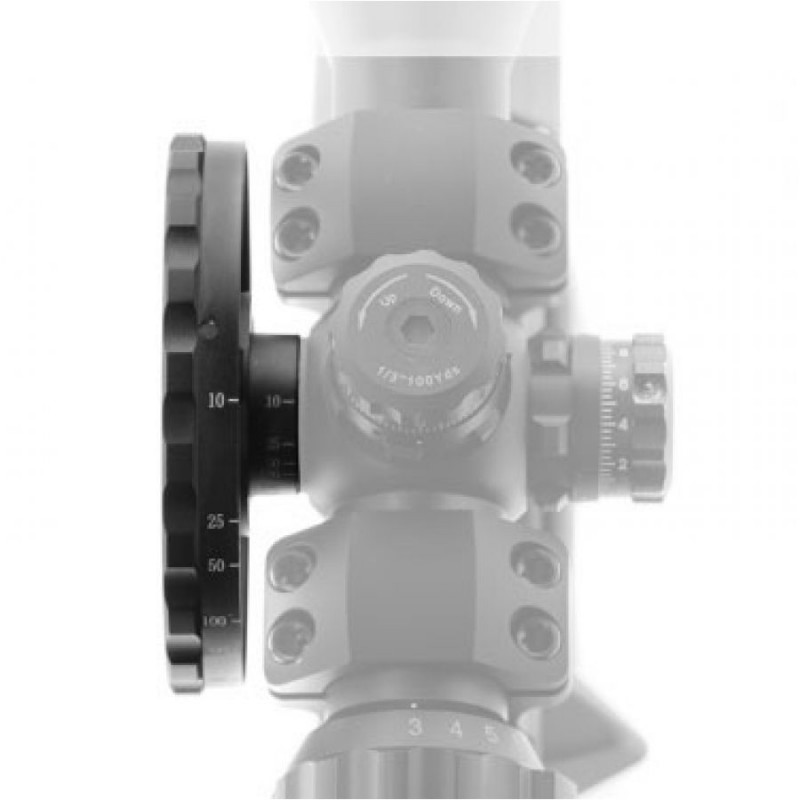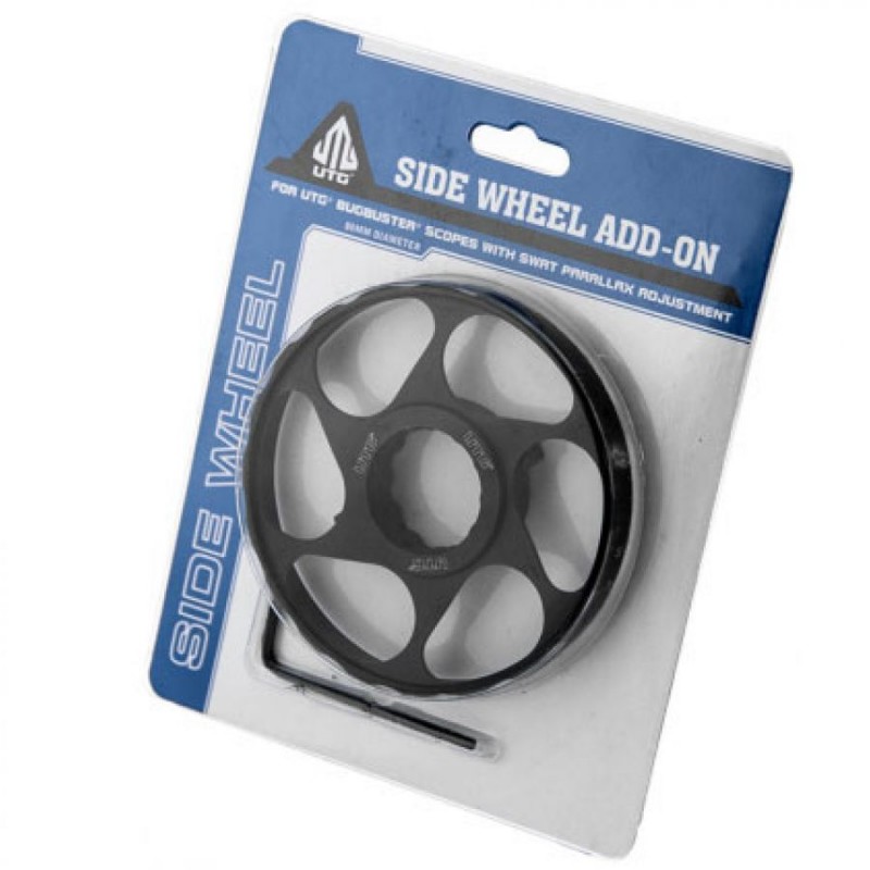 UTG SIDE WHEEL ADD-ON to aluminiowe koło o średnicy 80 mm służące do precyzyjnej regulacji paralaksy. Wykonane z anodowanego aluminium jest lekkie, wytrzymałe i łatwe w montażu. Na zewnętrznych krawędziach laserowo wytrawiono znaczniki dystansu (w jardach), które pomogą w precyzyjnej regulacji lunety.