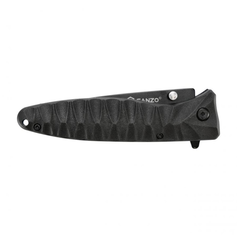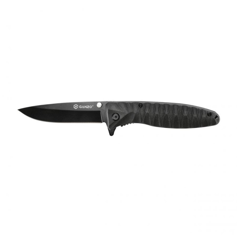 Model Ganzo G620-B1 to nóż posiadający ostrze z czarnym pokryciem oraz teksturowane okładziny rękojeści w kolorze czarnym.