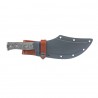 Do noża dołączono kydexową pochwę. Wyposażono ją w skórzaną szlufkę, pozwalającą przenosić narzędzie przy pasie.