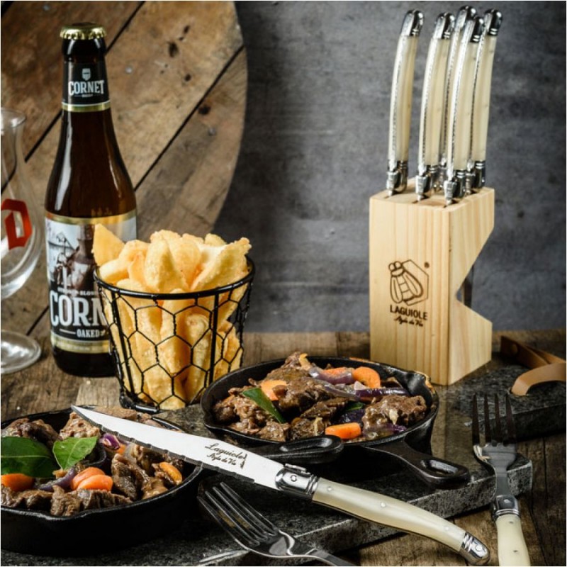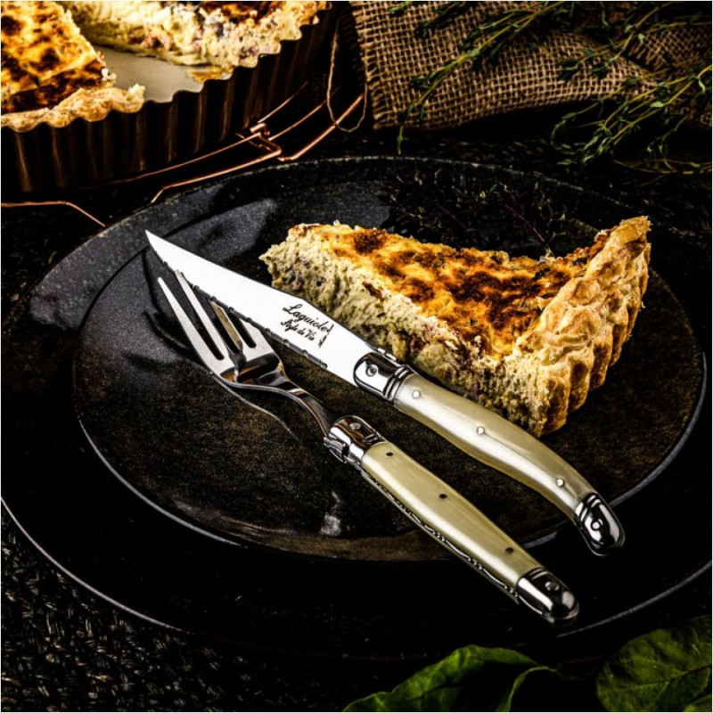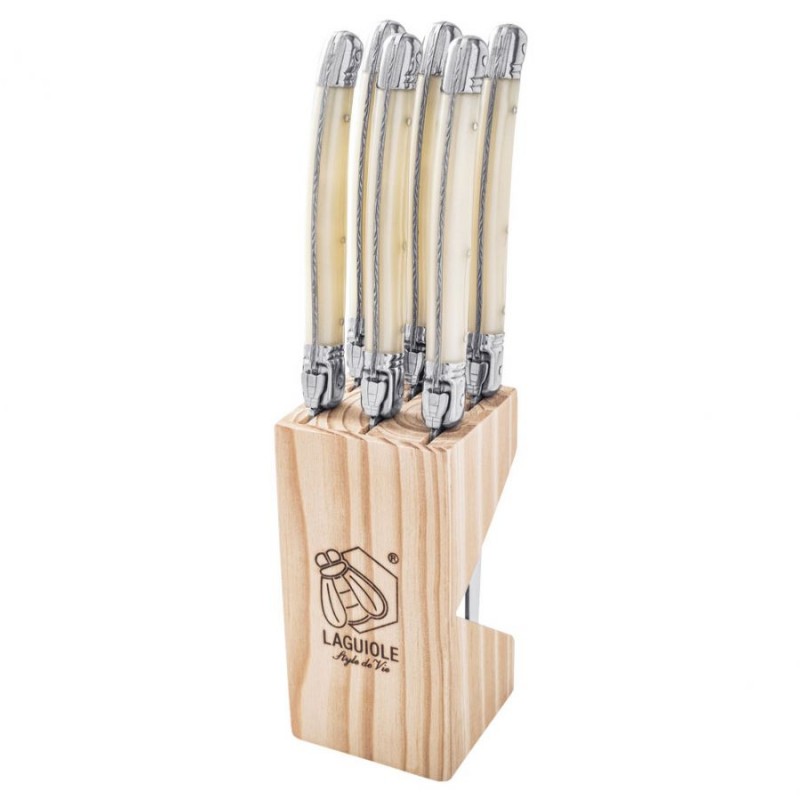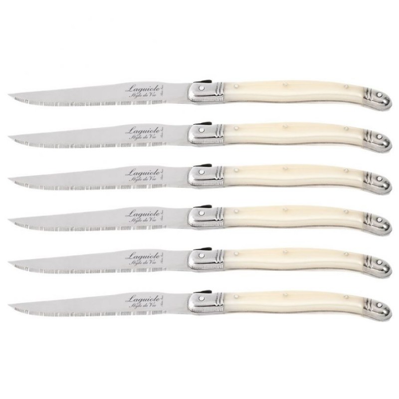 Komplet przeznaczonych do steków noży kuchennych marki Laguiole Style de Vie, gwarantujący komfort krojenia tej niekiedy wymagającej potrawy. Ząbkowana głownia pozwoli nam poradzić sobie z mniej delikatnymi wykrojami, a stylowy projekt noża doskonale wpisze się w estetykę kuchni w tradycyjnym stylu. Konstrukcja swoim wzornictwem nawiązuje do tradycyjnych prowansalskich noży składanych, których korzenie sięgają początków XIX wieku.