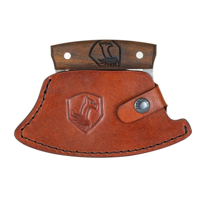 Rękojeść noża tworzą okładziny z orzecha włoskiego mocowane do trzpienia 2 nitami, które wspaniale podkreślają klasyczny styl noża używanego nadal przez Innuitów. Do bezpiecznego noszenia noża służy ręcznie szyta pochewka z naturalnej skóry.
