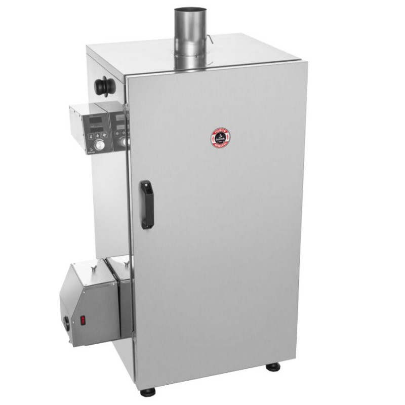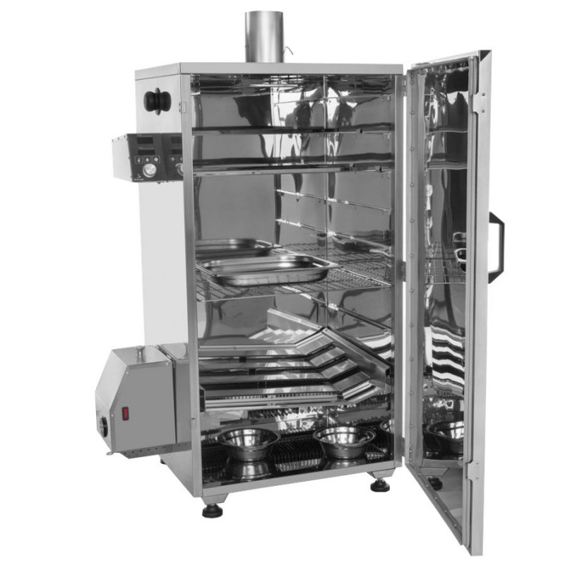 Korpus zewnętrzny wędzarni także powstał ze stali nierdzewnej, która jest odporna na zmienne pogodowe panujące na zewnątrz. Wnętrze komory wędzarniczej wyłożono blachą z atestowanej stali nierdzewnej dopuszczonej do kontaktu z żywnością. Podczas spalania zrębków generator wytwarza dym wędzarniczy niezbędny do wędzenia. Spirala transportuje zrębki na powierzchnię grzałkę, gdzie są poddawane kontrolowanemu spalaniu. Proces ten odbywa się w sposób ciągłym, co gwarantuje efektywne rozprowadzenie dymu wewnątrz całej komory i wpływa na doskonałą jakość wędzonych wyrobów. Zasypanie zasobnika generatora dymu 2 l wiórkami pozwala na wędzenie do 8 godzin.