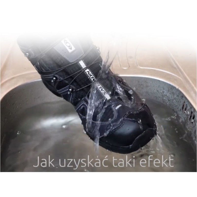 Uwaga! W przypadku jasnej skóry obuwia, preparat najlepiej nanieść w mniej widoczne miejsce np. język. Obuwie pokryte impregnatem nie powinno być suszone w bezpośrednim sąsiedztwie ognia lub grzejnika.