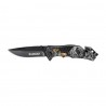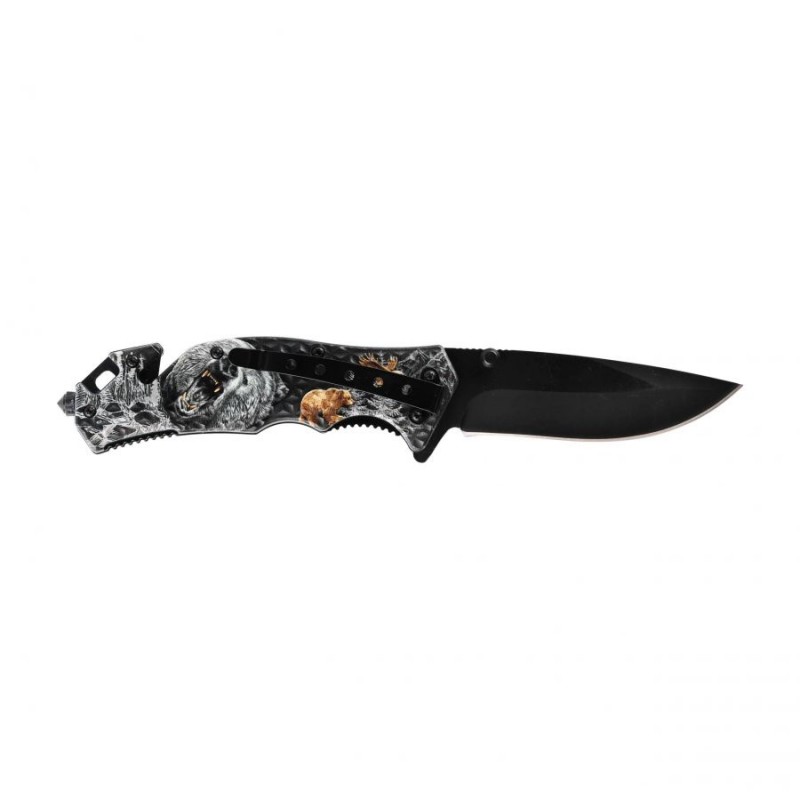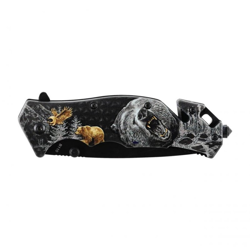 Wykonana z nierdzewnej stali, długa na 85 mm i pokryta antykorozyjną farbą klinga pomoże przygotować posiłek, wystrugać coś, okorowywać gałąź lub batonować drewno na rozpałkę. Uwagę zwraca interesujący motyw, którym przyozdobiono rękojeść – leśny plener z wyobrażeniem niedźwiedzia i drapieżnego ptaka.