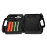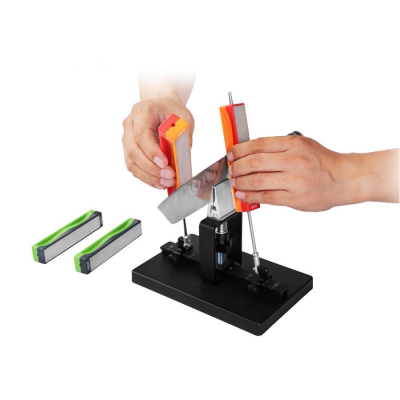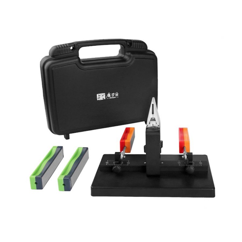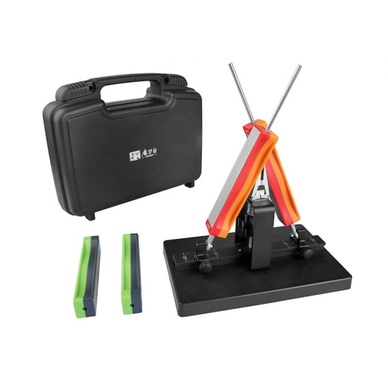 Rozłożenie systemu zajmuje niewiele czasu, na podstawie należy osadzić szynę z podziałką kątową i uchwyt noża oraz połączyć diamentowe ściernice (4 sztuki w zestawie) z prowadnicami (2 sztuki w zestawie). Złożoną ostrzałkę można wygodnie przenosić w polimerowej walizeczce o poręcznym rozmiarze.