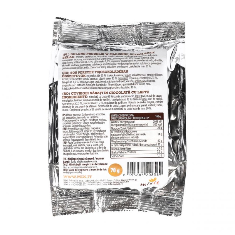 Każdy precelek Mixit pokryty jest delikatną mleczną czekoladą, dzięki czemu jest idealnym połączeniem słodkiego i słonego smaku.
