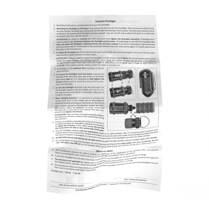 Latarka dedykowana do wszystkich modeli pałek teleskopowych marki ESP. Ułatwia prowadzenie pracy w ciemności. Latarka pozwala użytkownikowi na monitoring zaciemnionej powierzchni, dysponując jednocześnie pałką gotową do natychmiastowego użycia w razie zagrożenia. Zaletę takiej modyfikacji pałki docenią szczególnie służby prowadzące 24 godzinną ochronę obiektów wszelkiej użyteczności oraz osoby prywatne. Po demontażu latarki z pałki można ją używać jako samodzielną latarkę kieszonkową. Latarka wykonana jest z duralowego wodoszczelnego korpusu czyniąc ją niewrażliwą na działanie niekorzystnych warunków atmosferycznych. Zastosowanie oszczędnego oświetlenia typu LED daje 250 godzinny czas pracy latarki. Montowana na gwint w miejsce wykręcanej zaślepki.