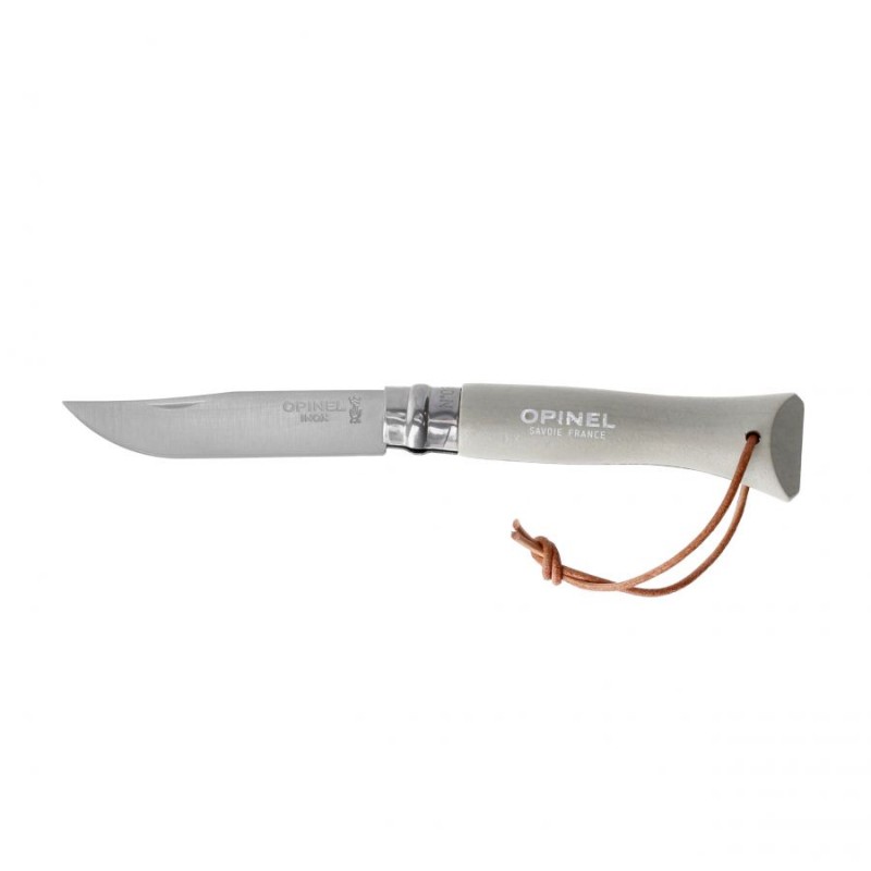 Opinel Colorama 06 inox szary z rzemieniem to składany nóż outdoorowy, wyposażony w ostrze ze stali nierdzewnej Sandvik 12C27M, blokadę Virobloc, oraz drewnianą rękojeść z rzemieniem do mocowania.