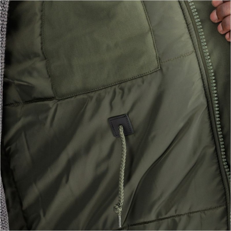Parka posiada solidny zamek błyskawiczny, osłonięty klapą zapinaną na duże, „kanadyjskie” guziki. Te z łatwością poddadzą się palcom osłoniętym nawet grubą rękawiczką. Kurtka ma sześć kieszeni: dwie głębokie i ocieplane na piersiach, dwie na poziomie pasa, jedną na rękawie oraz jedną wewnętrzną. Kieszenie zewnętrzne zamykane są na zatrzaski.