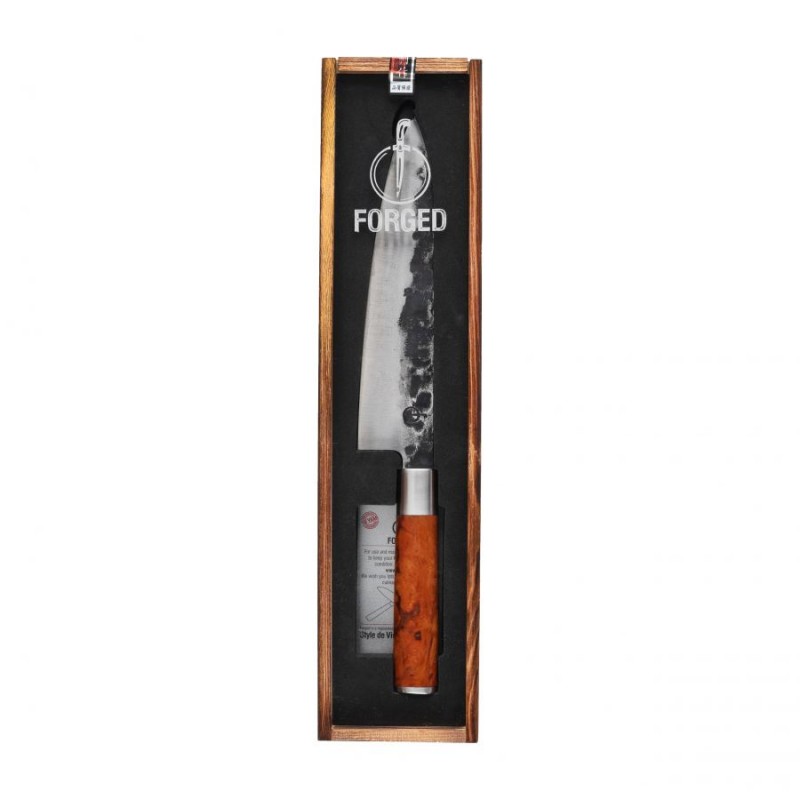 Nóż szefa kuchni Forged VG10 oferuje użytkownikowi:Jak sama nazwa wskazuje, domeną marki Forged są noże kuchenne wykonane w tradycyjnej technologii kucia. Dzięki temu zabiegowi otrzymujemy wysokiej klasy narzędzia, przewyższające znacząco modele walcowane zarówno pod kątem wytrzymałości jak i sztywności co ułatwi precyzyjne ciecie twardych materiałów. Pozostałością po procesie skuwania stali jest tekstura zdobiąca nieszlifowaną krawędź głowni, która nadaje każdemu egzemplarzowi niepowtarzalnego charakteru.