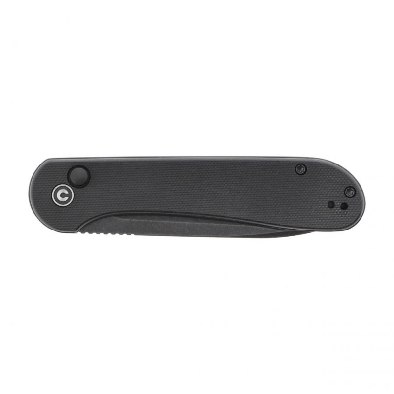Rękojeść Civivi Elementum wykonano z barwionego na czarno tworzywa G10. Ten kompozyt z włókna szklanego i syntetycznej żywicy jest lekki i niepodatny na uszkodzenia mechaniczne. Chropowata faktura okładzin sprawia, że nóż dobrze leży nawet w spoconej dłoni. W tylnej części rękojeści umieszczono tzw. backspacer, wykonany z tego samego tworzywa, co okładziny. Znajduje się tam również otwór na linkę lub smycz. Tuż nad przyciskiem blokady można znaleźć małe logo marki.