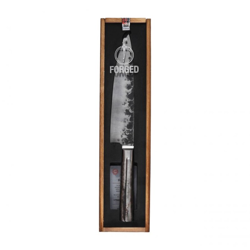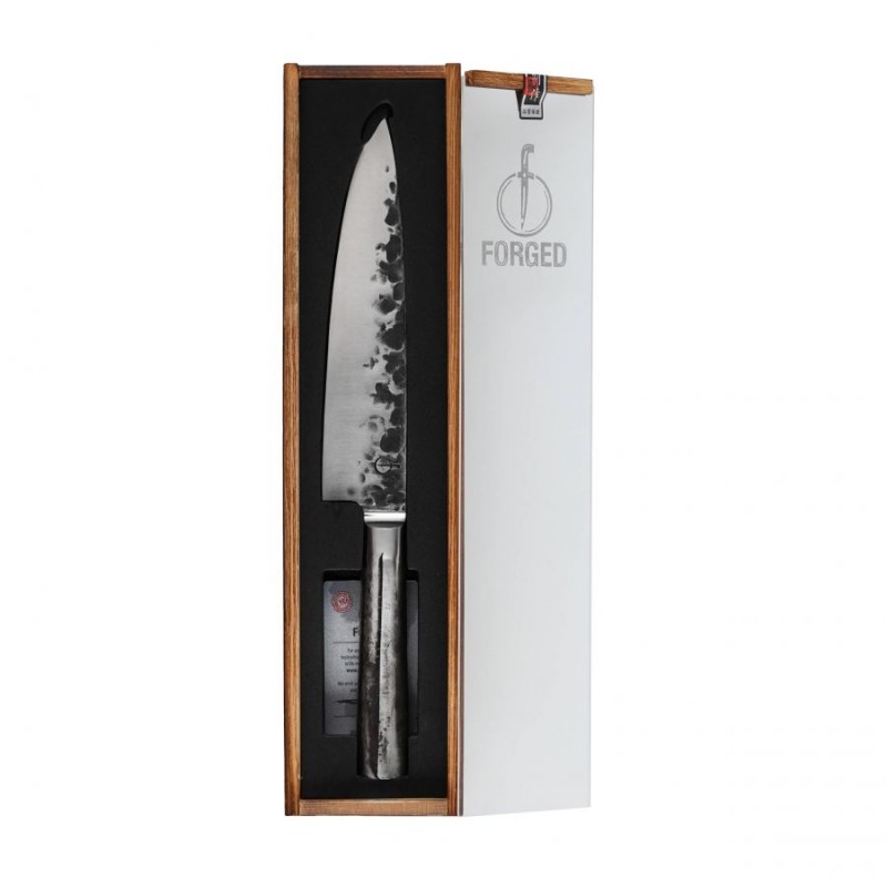 Nóż szefa kuchni Forged Intense oferuje użytkownikowi:Jak sama nazwa wskazuje, domeną marki Forged są noże kuchenne wykonane w tradycyjnej technologii kucia. Dzięki temu zabiegowi otrzymujemy wysokiej klasy narzędzia, przewyższające znacząco modele walcowane zarówno pod kątem wytrzymałości jak i sztywności co ułatwi precyzyjne ciecie twardych materiałów. Pozostałością po procesie skuwania stali jest tekstura zdobiąca nieszlifowaną krawędź głowni, która nadaje każdemu egzemplarzowi niepowtarzalnego charakteru.