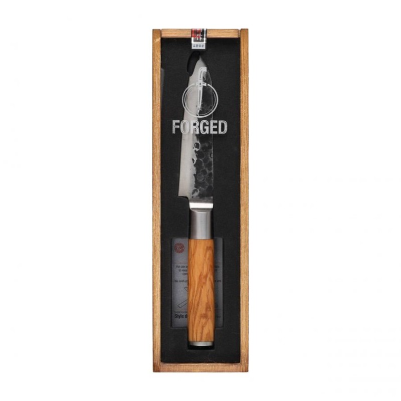 Nóż Santoku Forged Olive oferuje użytkownikowi:Jak sama nazwa wskazuje, domeną marki Forged są noże kuchenne wykonane w tradycyjnej technologii kucia. Dzięki temu zabiegowi otrzymujemy wysokiej klasy narzędzia, przewyższające znacząco modele walcowane zarówno pod kątem wytrzymałości jak i sztywności co ułatwi precyzyjne ciecie twardych materiałów. Pozostałością po procesie skuwania stali jest tekstura zdobiąca nieszlifowaną krawędź głowni, która nadaje każdemu egzemplarzowi niepowtarzalnego charakteru.