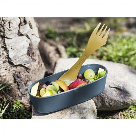 Łyżykowidelec wykonano z biodegradowalnego tworzywa sztucznego na bazie kukurydzy, wolnego od bisfenolu i odpornego na wysoką temperaturę oraz mycie w zmywarkach. Długość 17 cm pozwala także na wygodne spożywanie liofilizatu bezpośrednio z torebki.