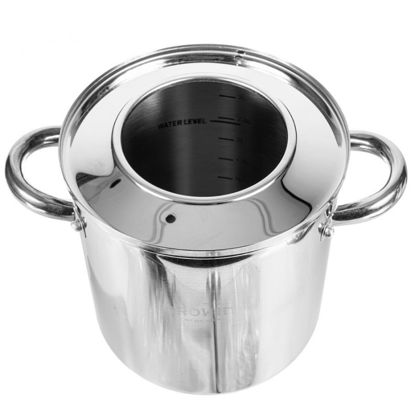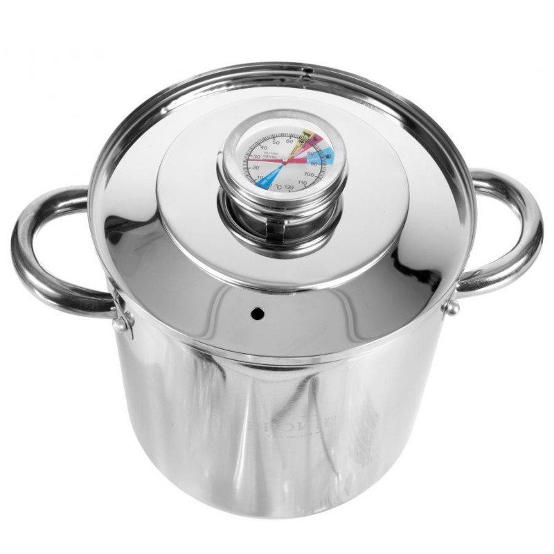 Dzięki przemyślanej konstrukcji proces parzenia odbywa się w sposób bardzo równomierny. Komplet składa się z szynkowaru 1,5 kg, garnka o pojemności 4 L oraz stalowego kołnierza, który utrzymuje szynkowar nad dnem garnka. Dopasowany kołnierz zapobiega parowaniu wody, dlatego nie musimy jej dolewać oraz obawiać się rozlewania na kuchence. Dzięki dwóm termometrom możemy precyzyjnie monitorować temperaturę mięsa oraz wody.