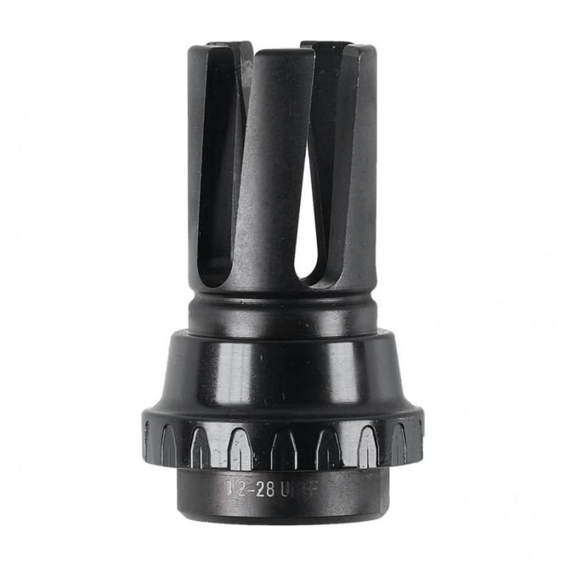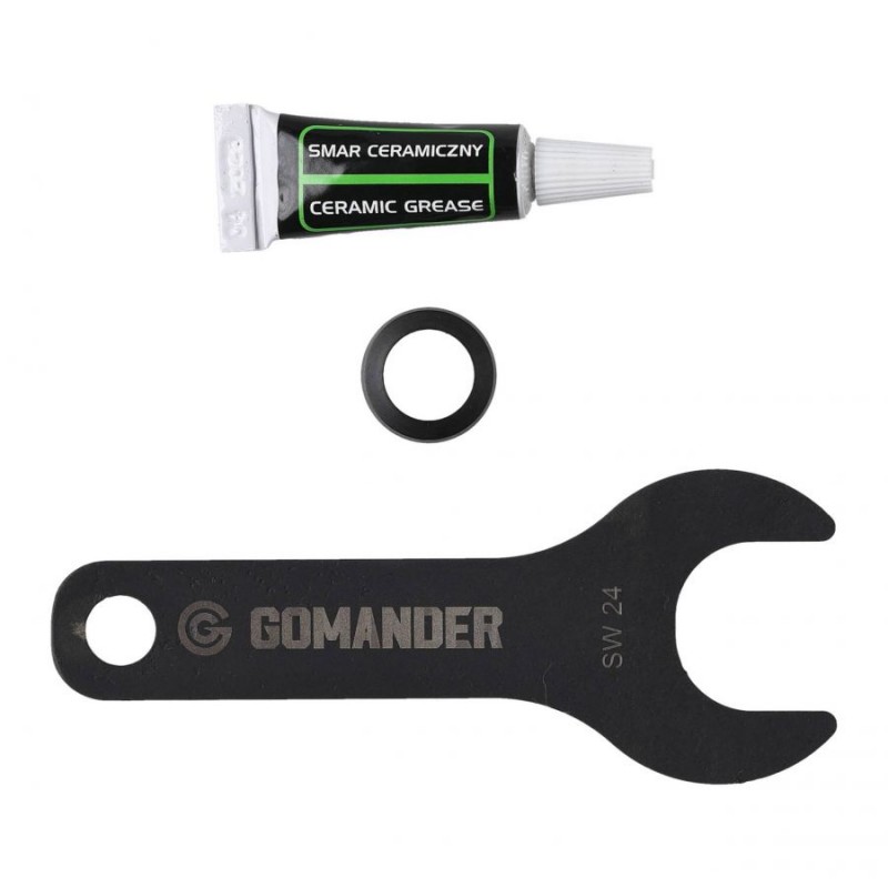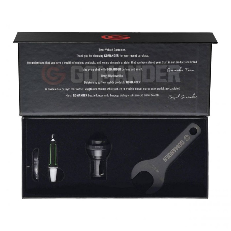 Zawartość zestawu: kompensator płomienia Gomander Quadron 9.0 1/2 × 28 UNEF, podkładka sprężynująca, nakrętka zabezpieczająca gwint, smar ceramiczny, kluczyk montażowy.