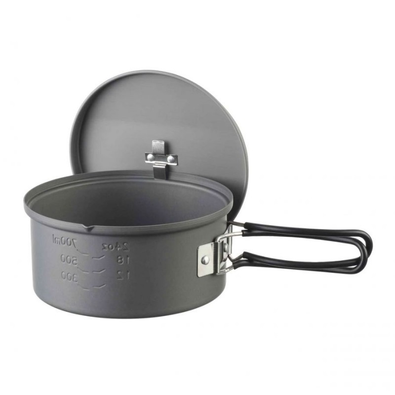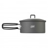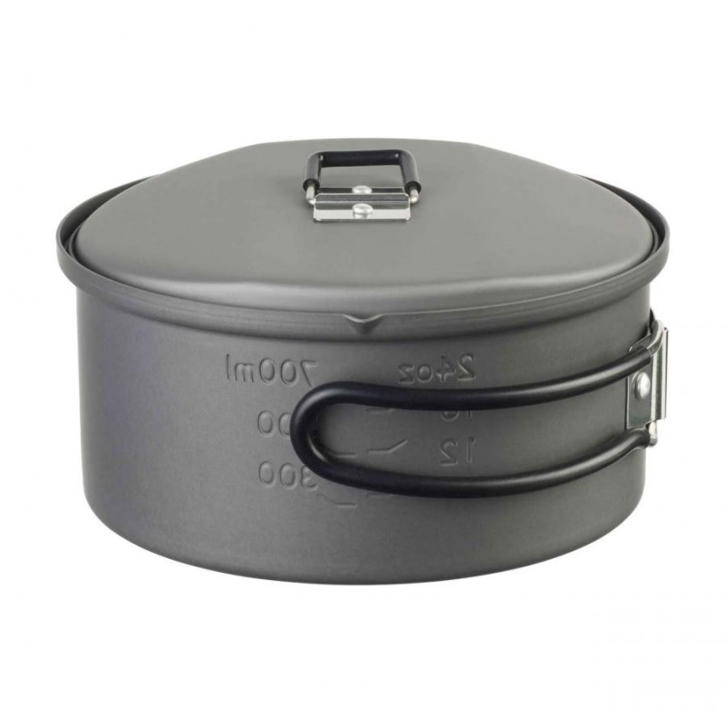 Esbit Aluminium Pot o pojemności 1100 ml to klasyczne naczynie turystyczne, w które skład wchodzi garnek oraz pokrywka. Oba elementy wykonano z anodowanego aluminium o szarym kolorze i chropowatej fakturze. Dodatkowo uchwytu wykonano ze stali nierdzewnej i wykończono silikonem. Garnek ma też wewnętrzną podziałkę i mililitrach oraz uncjach, ułatwiającą odmierzenie właściwej ilości płynu. Do kompletu dołączono dodatkowy pokrowiec wykonany z siatki.
