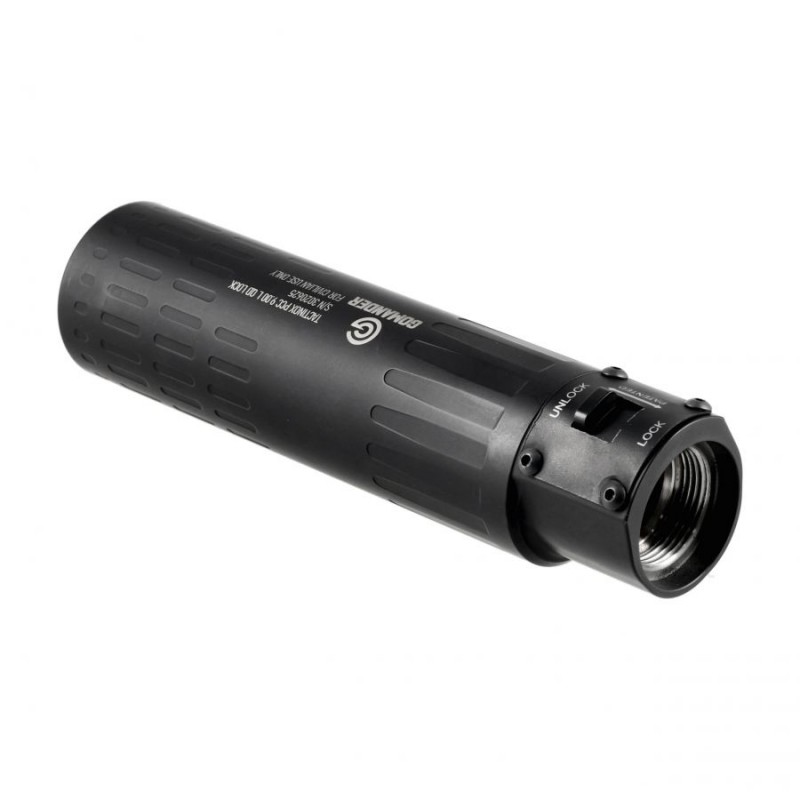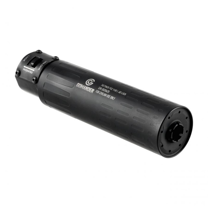 Tłumik Gomander Tactinox 9L PCC QD został stworzony do użytku z karabinkami PCC z myślą o prowadzeniu intensywnego ognia. Tłumik w najnowszej wersji wyposażonej w innowacyjny system szybkiego montażu i demontażu QD Lock z gwintem M26x1,5. Model w kolorze czarnym. Tłumik dźwięku Tactinox stworzono z myślą o zastosowaniach taktycznych – a zatem wykorzystaniu pod charakterystyka intensywnym ogniem na broni samopowtarzalnej. Geometria wnętrza urządzenia powoduje minimalny powrót gazów prochowych do komory, dzięki czemu tłumik nie jest uciążliwy podczas strzelania oraz ogranicza zanieczyszczenie broni.