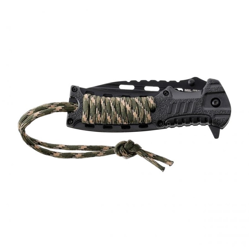 Nóż ma antypoślizgowe okładziny z tworzywa sztucznego, w których schowany jest zapas linki paracord oraz krzesiwo z gwizdkiem alarmowym. Dzięki takiej funkcjonalności, w razie awaryjnej sytuacji mamy przy sobie mocny sznurek, gwizdek ratunkowy do wzywania pomocy oraz krzesiwo, za pomocą którego jesteśmy w stanie rozpalić ogień. Wygodne przenoszenie noża w kieszeni lub przy pasie umożliwia sprężysty klips (bez możliwości przełożenia). Survivalowy nóż składany Mil-Tec wyposażony w krzesiwo, gwizdek oraz paracord to funkcjonalne narzędzie survivalowe, które doskonale sprawdzi się podczas wycieczki, bytowania w terenie oraz szkoleń survivalowych.